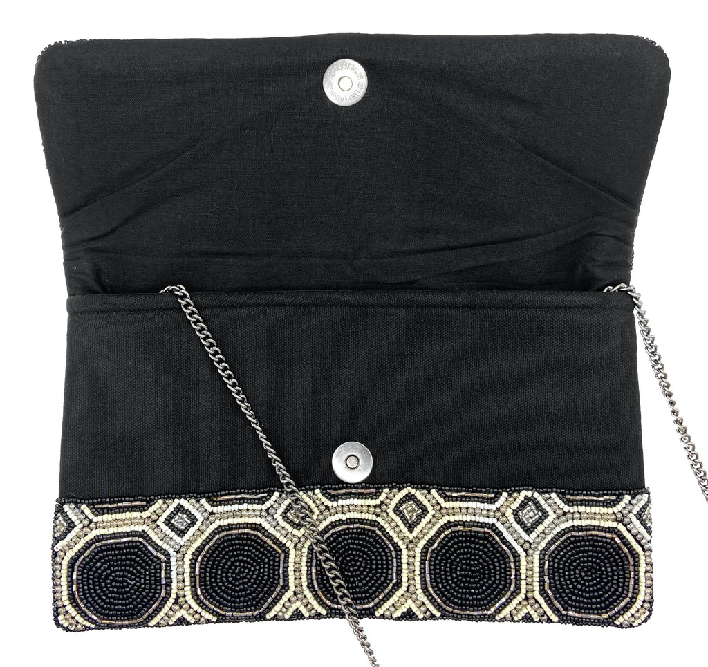 This versatile handcrafted clutch seamlessly transitions from an elegant handheld piece to a sophisticated cross-body bag with its included 45" polished silver chain strap. Crafted from premium jute cotton and thoughtfully lined for durability, each piece is meticulously made by hand in India.