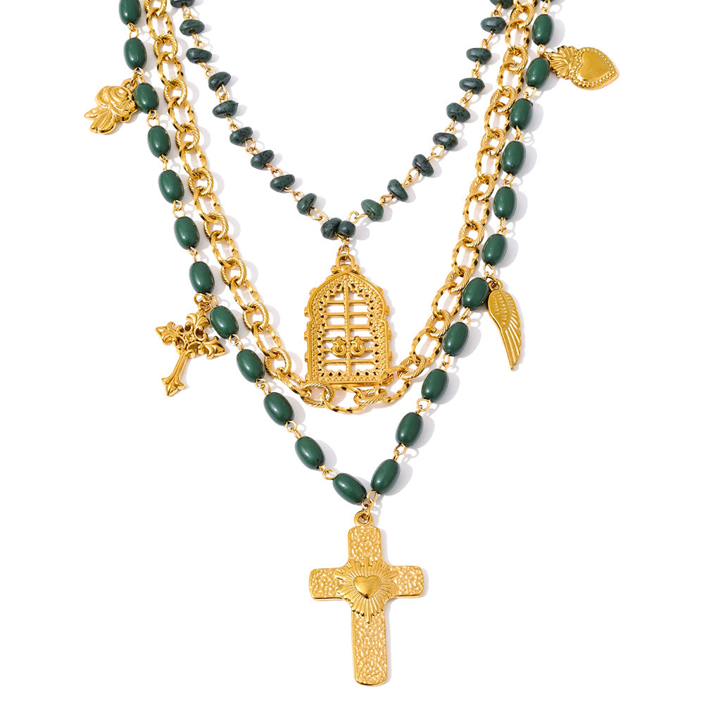 The Delia necklace features lovely green acrylic beads and a stunning crosses and medallion charms.
