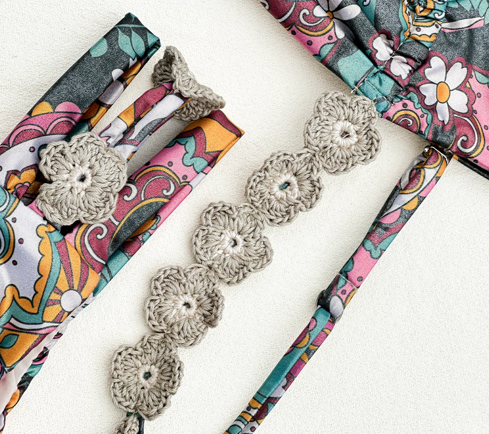The Kaay top features underwire soft cups with adjustable straps and crochet flower appliqués on the shoulder straps. The bottoms showcase strappy sides, crochet flower details on the hips, and a ruched back. Meticulously handcrafted by expert Peruvian artisans, this bikini set combines classic craftsmanship with an elegant and lively design.
