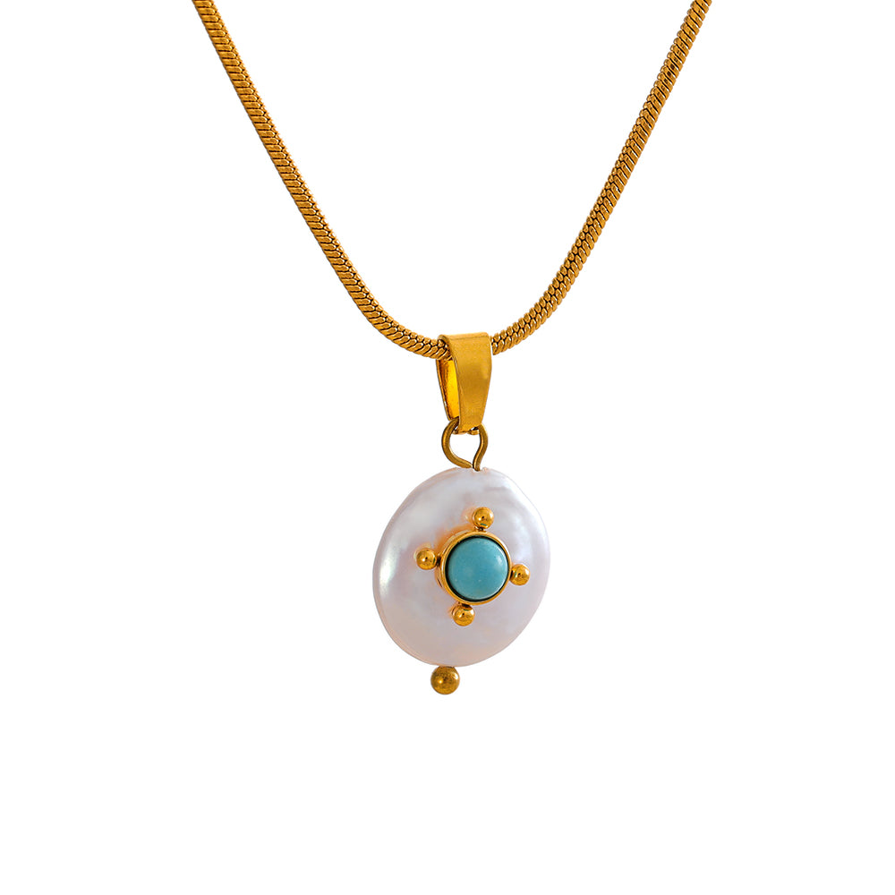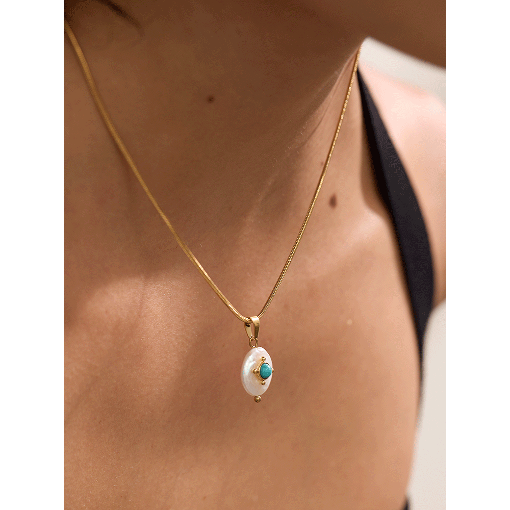 18K gold plated stainless steel necklace with a pearl pendant adorned wit turquoise bead.