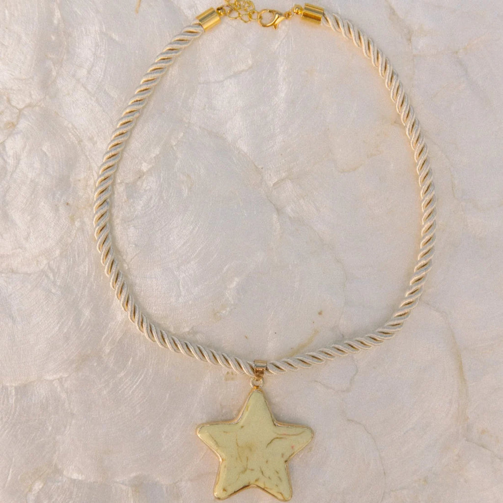 This Marina necklace is a 24k gold plated waterproof rope necklace that is both fashion and trendy! Paired with a faux turquoise yellow/orange star, this beautiful piece is the perfect necklace for any occasion.
