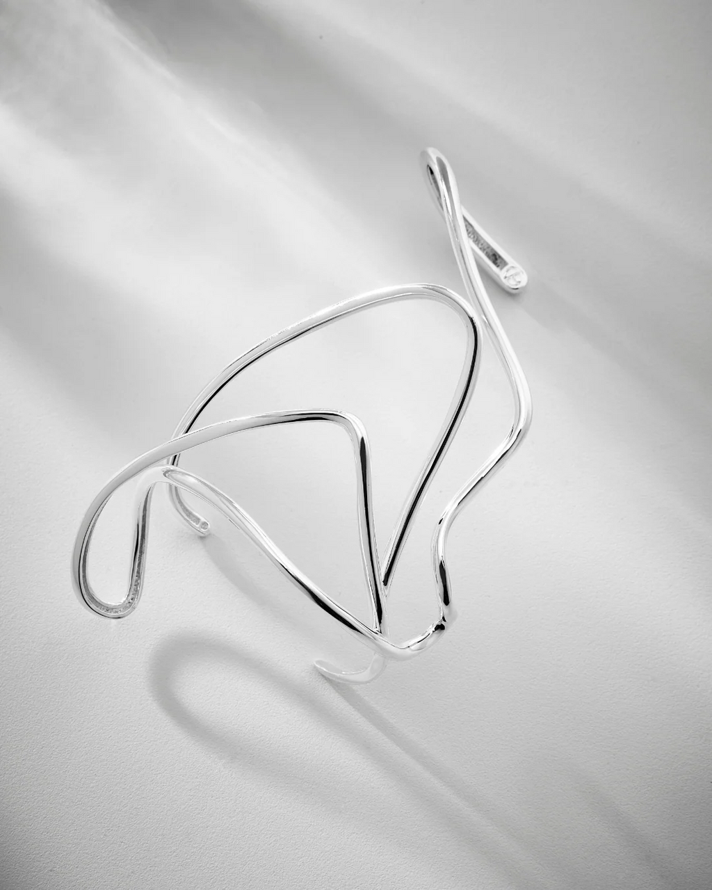 The Miragem Hand Bracelet captures the shimmering effect of heat waves on sand, symbolizing hope during challenging times. Made with gold and silver-plated noble metals, its polished design offers a modern and striking look.