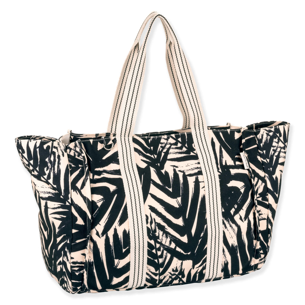 The Playa Shoulder Tote features a black and ivory design inspired by the tropics. Made with durable canvas this shoulder tote is perfect for carrying all your essentials while adding a touch of tropical charm to your style.