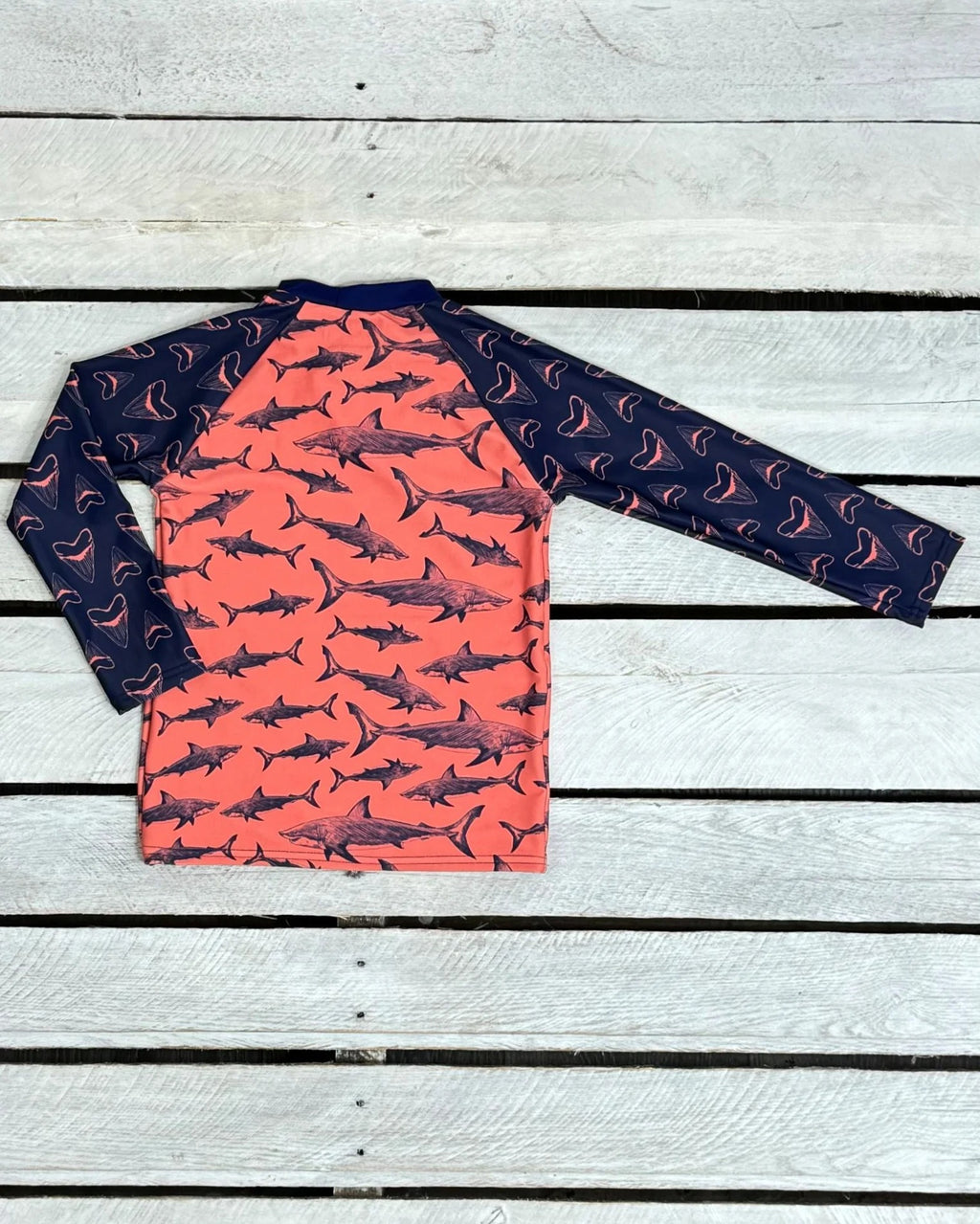 Your little surfer will look super cool in this shark themed long sleeve rash guard. Made of UPF 50+ fabric in the USA!