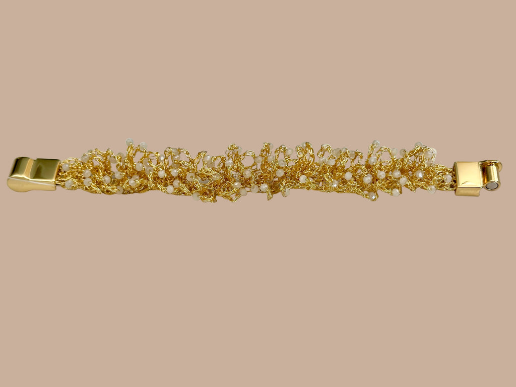 This hand-crocheted cuff was fabricated by skilled Brazilian artisans. The shiny 18 karat gold plated wire creates a statement look without weight or bulk! They are very comfortable to wear, light and can be worn in every occasion: day-to-night and casual-to-special.